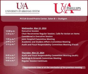 LITTLE ROCK (May 17, 2024) – The Board of Trustees of the University of Arkansas will hold its regularly scheduled board meetings in person and via videoconference May 22-23 at Phillips Community College of the University of Arkansas (PCCUA) Stuttgart Campus.