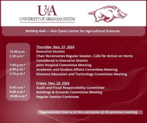 LITTLE ROCK (Nov. 19, 2024) – The Board of Trustees of the University of Arkansas will hold its regularly scheduled board meetings in person and via videoconference Nov. 21-22 at the University of Arkansas, Fayetteville.