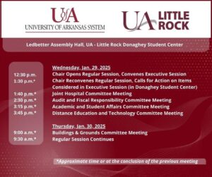 LITTLE ROCK (Jan. 27, 2025) – The Board of Trustees of the University of Arkansas will hold its regularly scheduled board meetings in person and via videoconference Jan. 29-30 at the University of Arkansas at Little Rock (UALR).